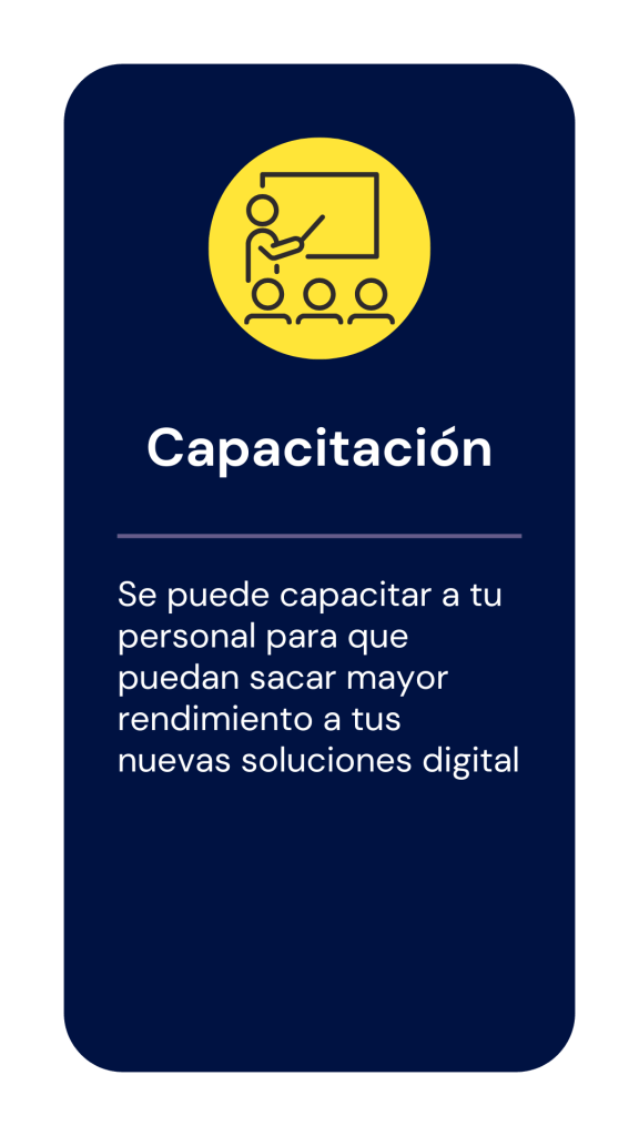 Identificamos un mínimo de tres posibles soluciones digitales/tecnológicas, incluyendo cómo cada una de esas soluciones beneficiará a tu empresa. También ayudamos a identificar las soluciones digitales que otorgaran más beneficios inmediatos a tu empresa.